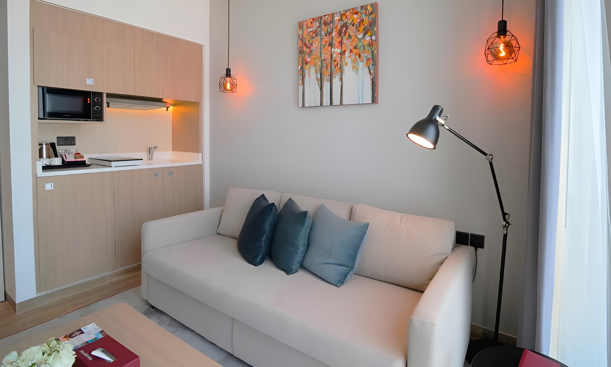 Двухкомнатный номер включает в себя спальню с кроватью размера king-size, гостиную с мини-кухней, ванную комнату с душем. В комплектации телевизор, кондиционер, сейф, Wi-Fi, электрический чайник, холодильник, плита, микроволновая печь, фен и гостиничная косметика.