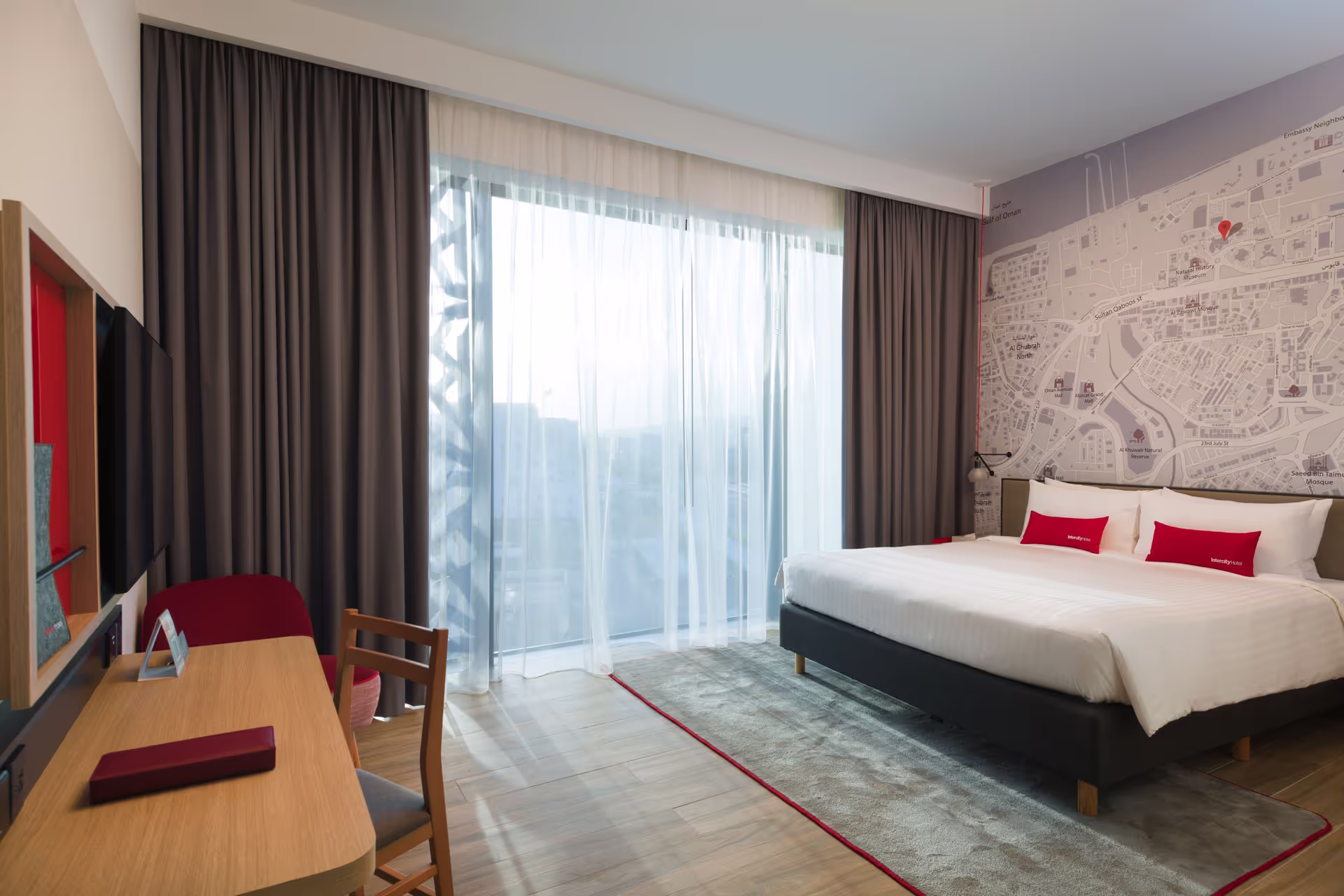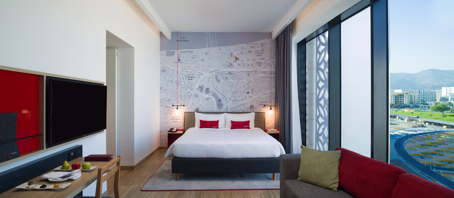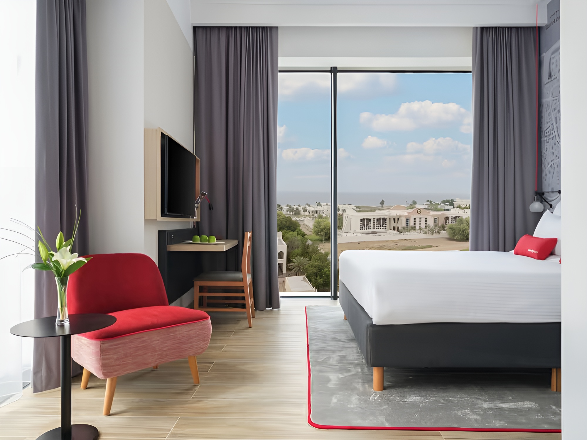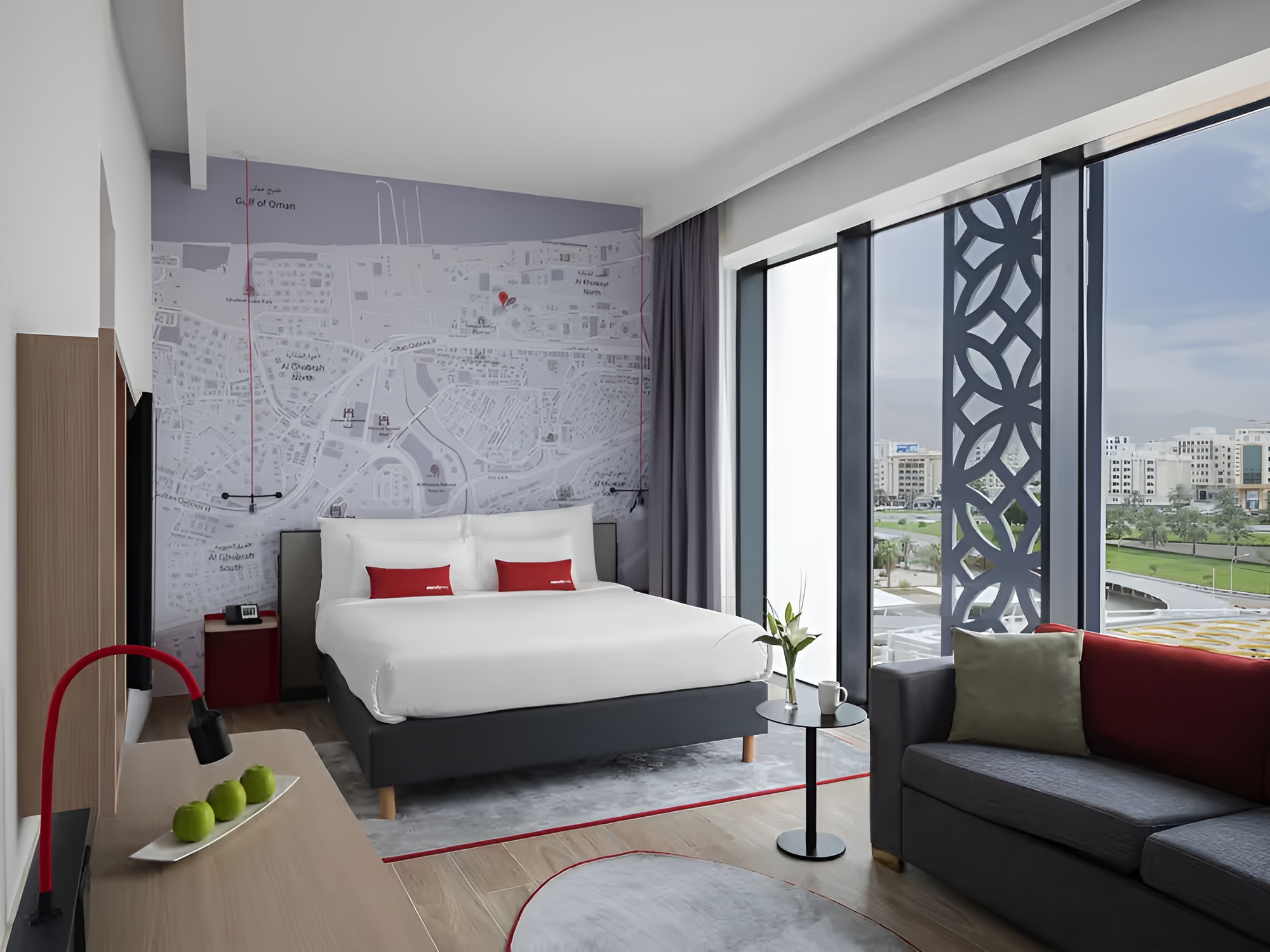 Просторный номер с панорамными окнами. Оборудован телевизором, кондиционером, беспроводными интернетом, телефоном, принадлежностями для чая/кофе, сейфом, феном. Гости размещаются на одной кровати размера king-size и диване. В номере собственный санузел с душем.