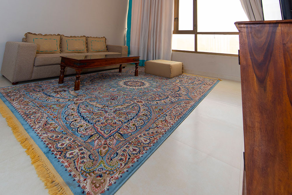 Номер в арабском стиле с балконом, гостиной с мягкой мебелью и спальней с двуспальной кроватью. Из удобств телевизор, кондиционер, электрические розетки, мини-бар, принадлежности для чая/кофе и душ.