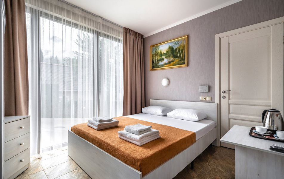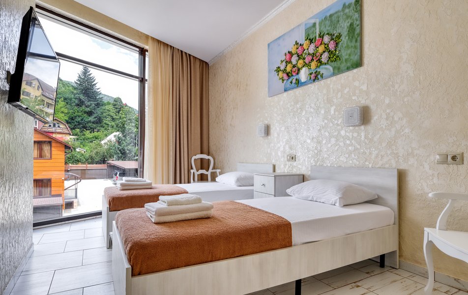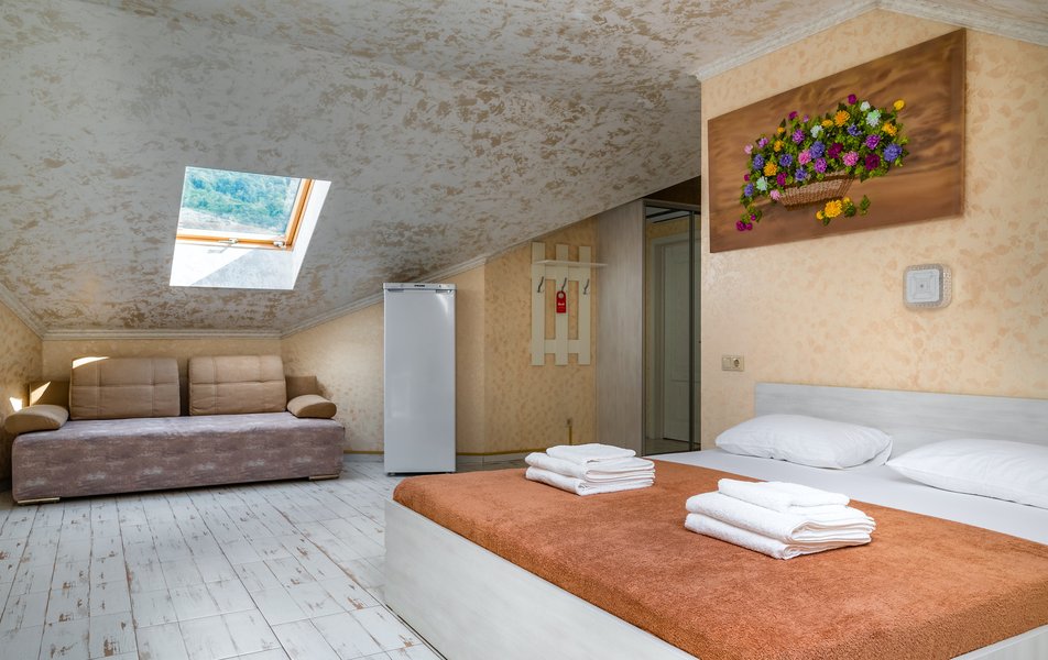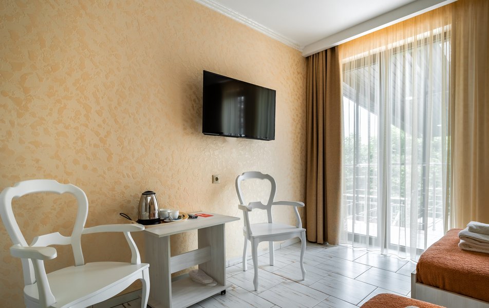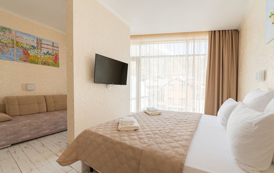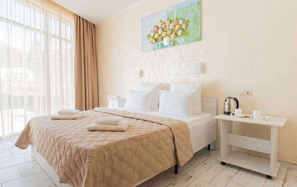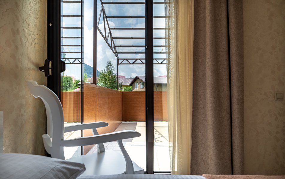 Делюкс 2-местный (с террасой вид, на горы) Количество комнат: 1-комнатный Тип номера: Делюкс Вид из номера: на горы Кол-во номеров: 7 Кол-во основных мест: 2 Площадь (кв. м): 16 Мебель: вешалка, зеркало, кровать двуспальная, прикроватные тумбочки, стол, стул, шкаф Оборудование: кондиционер, телевизор ЖК, утюг, холодильник, чайный набор посуды, электрочайник Санузел: с душем, тапочки, туалетные принадлежности, фен Сервис: Wi-Fi бесплатно, смена полотенец: 1 раз в 3 дня, смена постельного белья: 1 раз в 3 дня, уборка номера: ежедневно