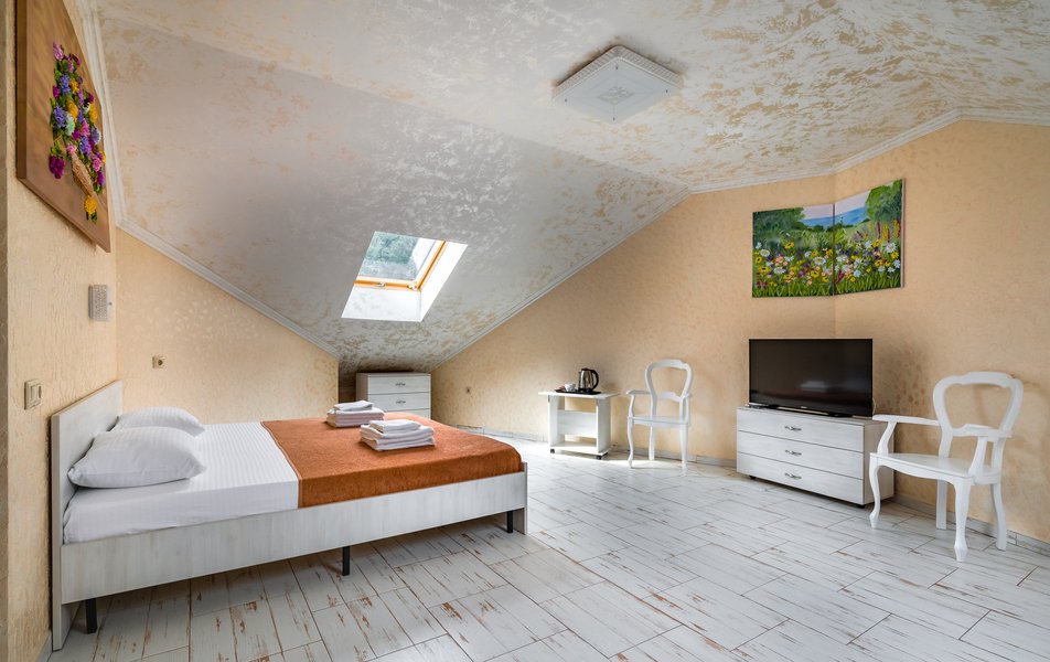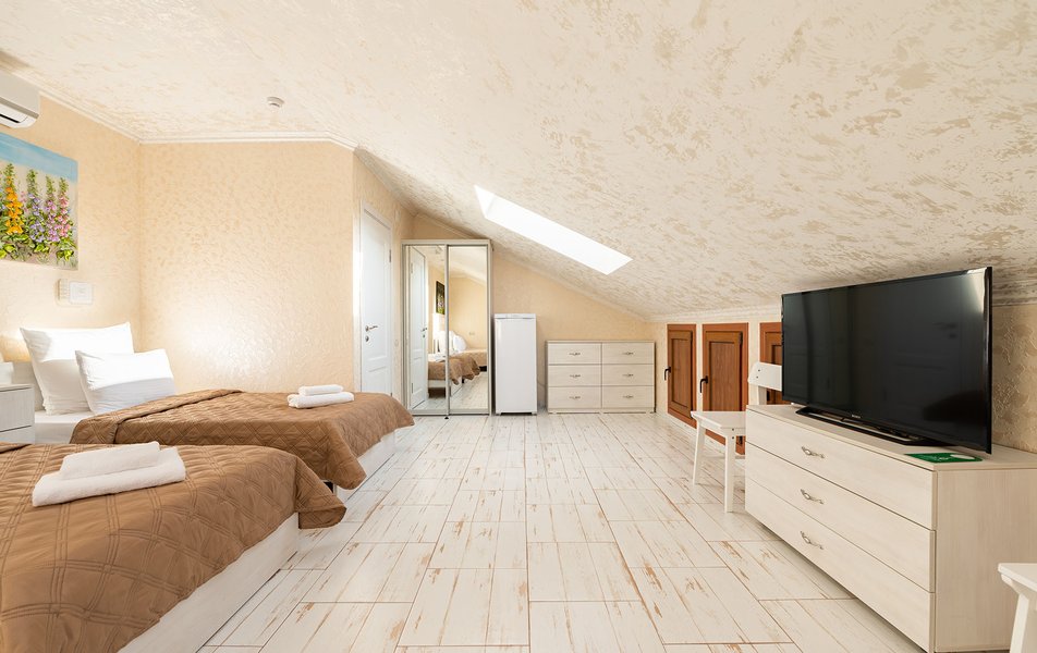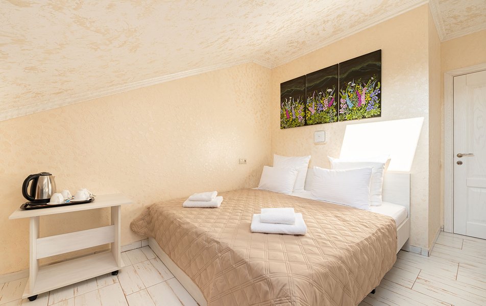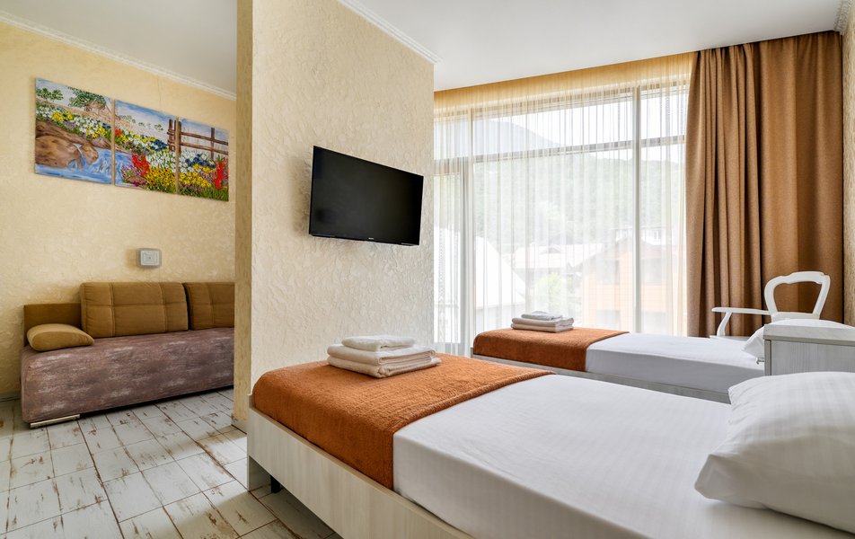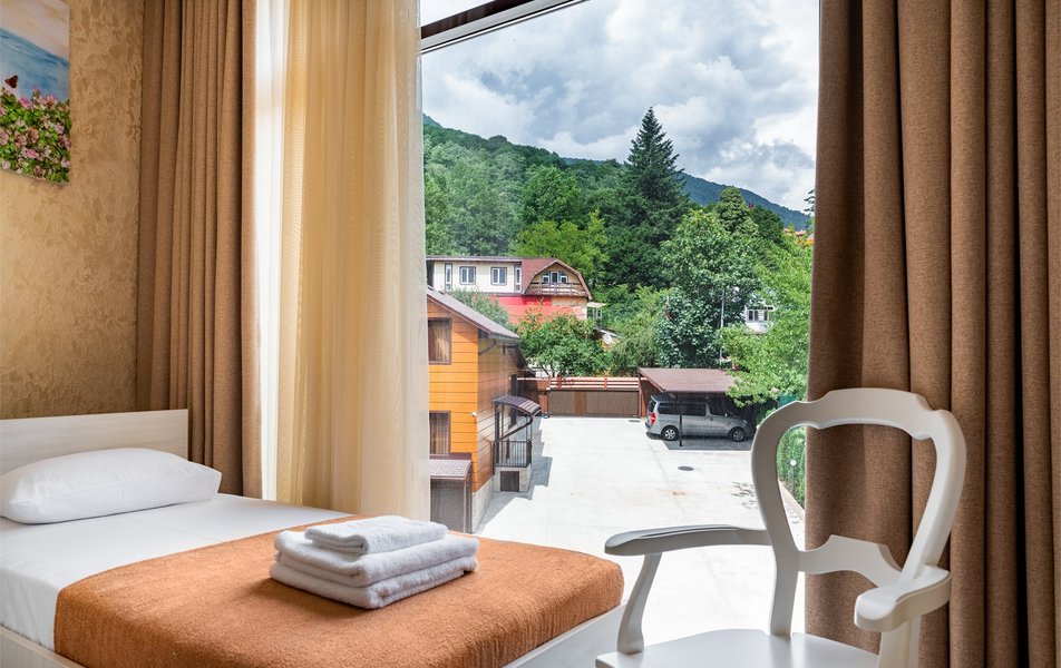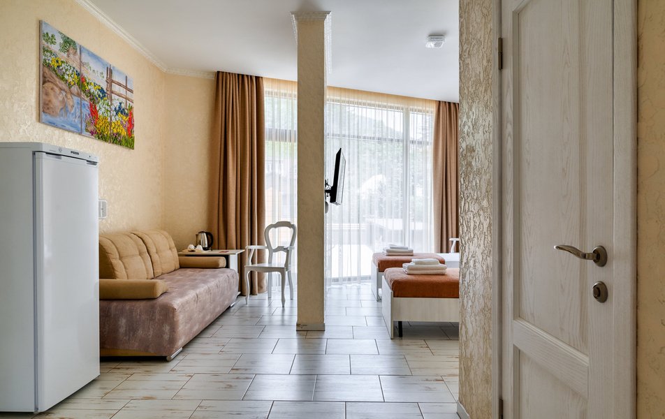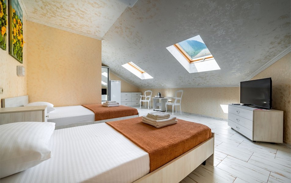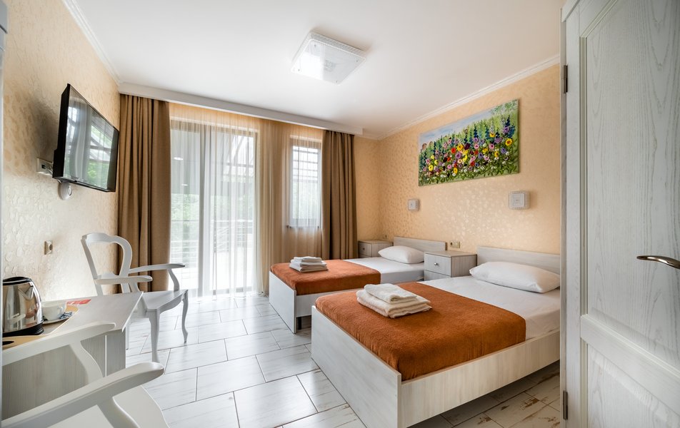 Делюкс 2-местный (с террасой вид, на горы) Количество комнат: 1-комнатный Тип номера: Делюкс Вид из номера: на горы Кол-во номеров: 7 Кол-во основных мест: 2 Площадь (кв. м): 16 Мебель: вешалка, зеркало, кровать двуспальная, прикроватные тумбочки, стол, стул, шкаф Оборудование: кондиционер, телевизор ЖК, утюг, холодильник, чайный набор посуды, электрочайник Санузел: с душем, тапочки, туалетные принадлежности, фен Сервис: Wi-Fi бесплатно, смена полотенец: 1 раз в 3 дня, смена постельного белья: 1 раз в 3 дня, уборка номера: ежедневно