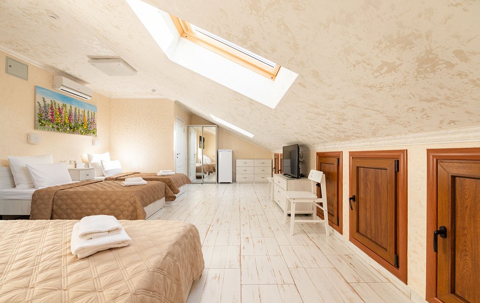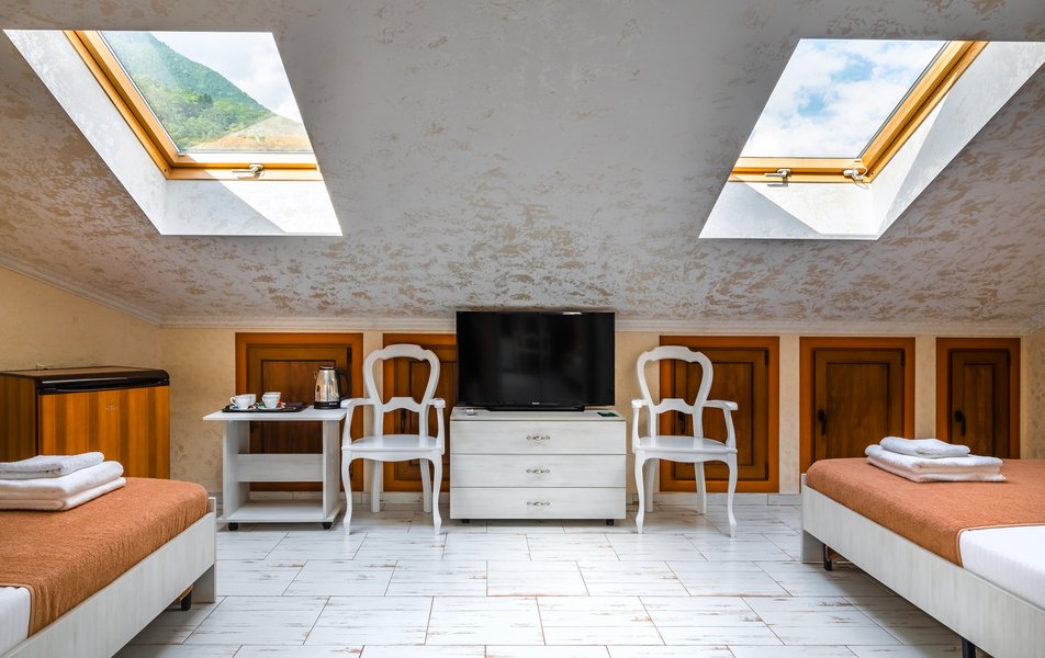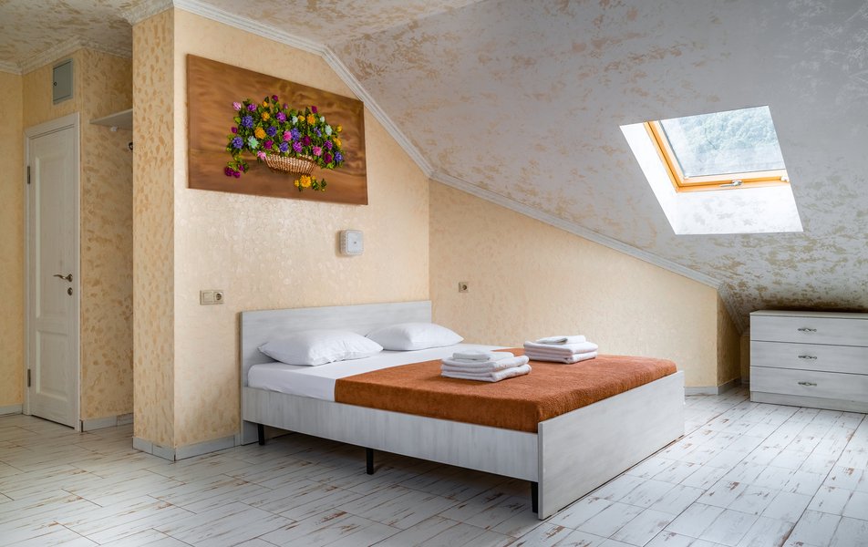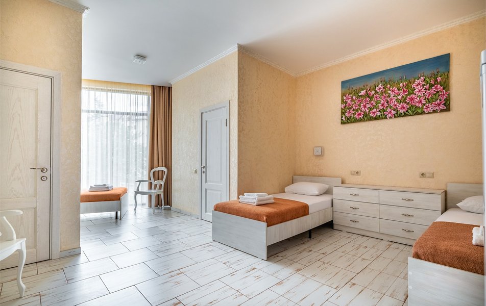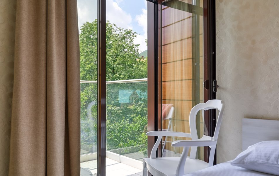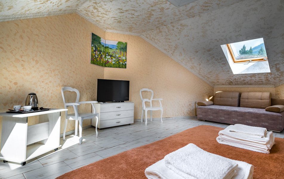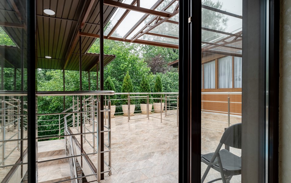 Делюкс 2-местный (с террасой вид, на горы) Количество комнат: 1-комнатный Тип номера: Делюкс Вид из номера: на горы Кол-во номеров: 7 Кол-во основных мест: 2 Площадь (кв. м): 16 Мебель: вешалка, зеркало, кровать двуспальная, прикроватные тумбочки, стол, стул, шкаф Оборудование: кондиционер, телевизор ЖК, утюг, холодильник, чайный набор посуды, электрочайник Санузел: с душем, тапочки, туалетные принадлежности, фен Сервис: Wi-Fi бесплатно, смена полотенец: 1 раз в 3 дня, смена постельного белья: 1 раз в 3 дня, уборка номера: ежедневно