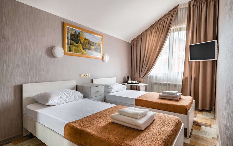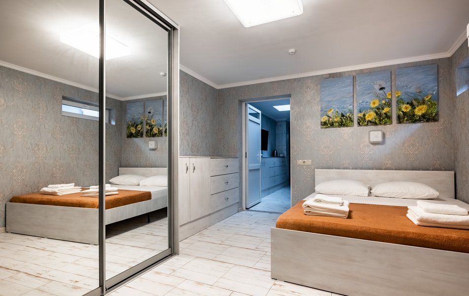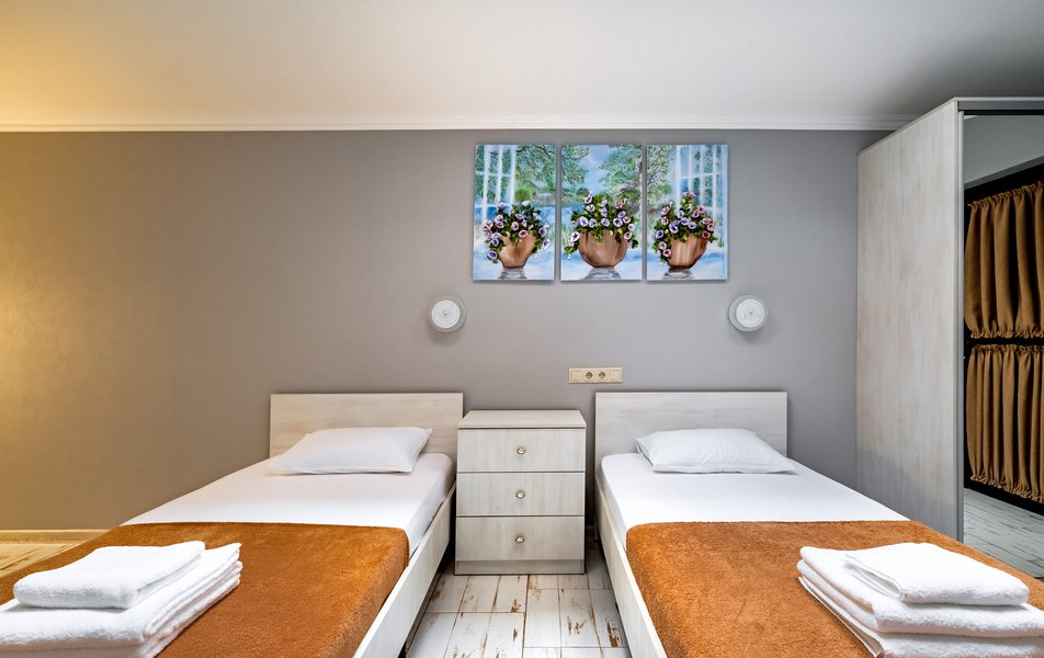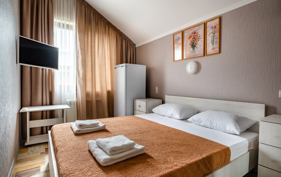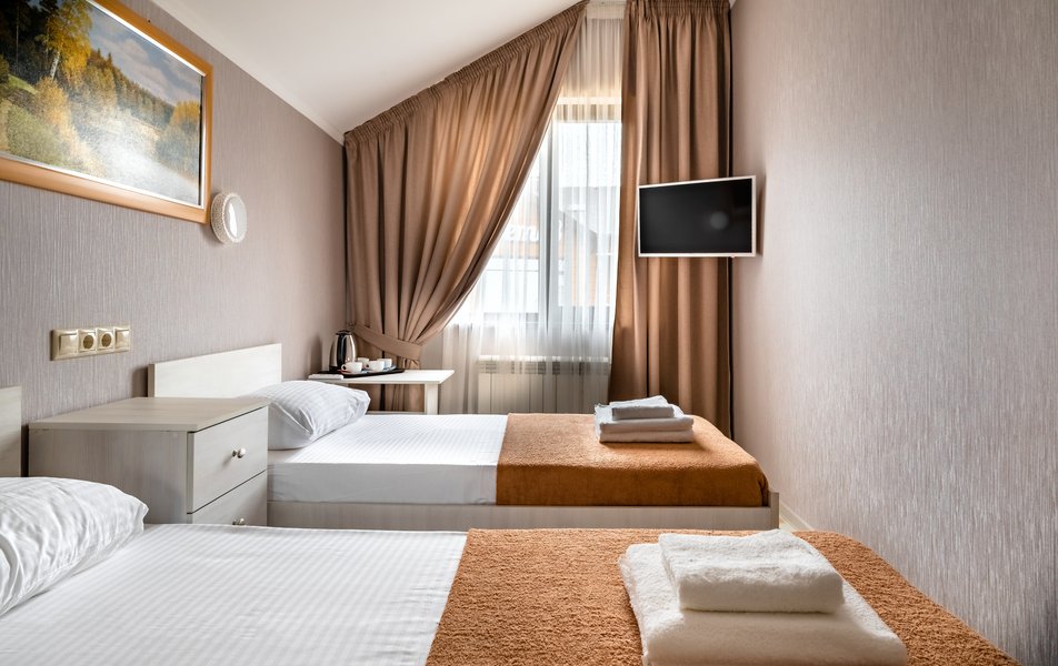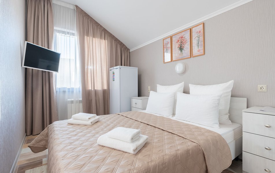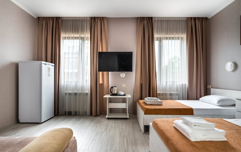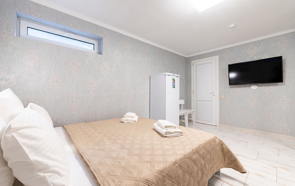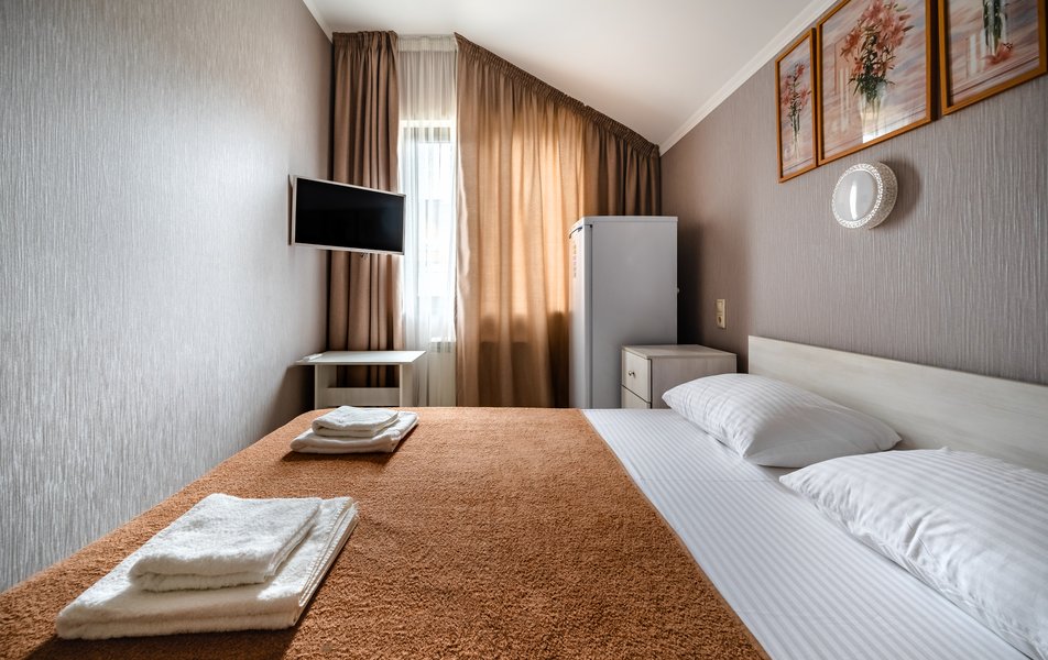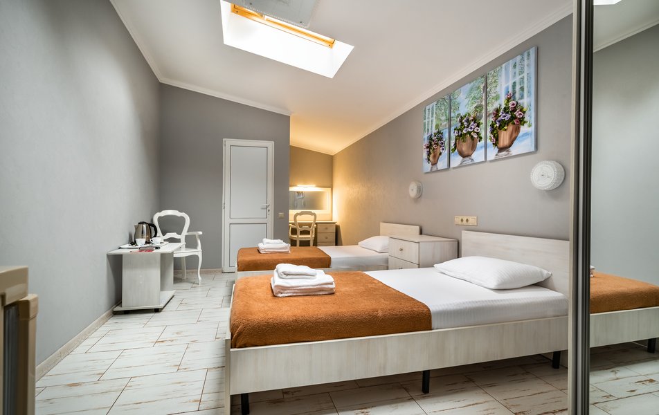 Бюджетный 2-местный (без окна) Количество комнат: 1-комнатный Тип номера: Стандартный Вид из номера: без окна Кол-во номеров: 1 Кол-во основных мест: 2 Площадь (кв. м): 15 Мебель: зеркало, кровати полутороспальные, прикроватная тумбочка, стол, стулья, шкаф Оборудование: кондиционер, телевизор ЖК, утюг, холодильник, чайный набор посуды, электрочайник Санузел: тапочки, туалетные принадлежности, фен Сервис: Wi-Fi бесплатно, смена полотенец: 1 раз в 3 дня, смена постельного белья: 1 раз в 3 дня, уборка номера: ежедневно