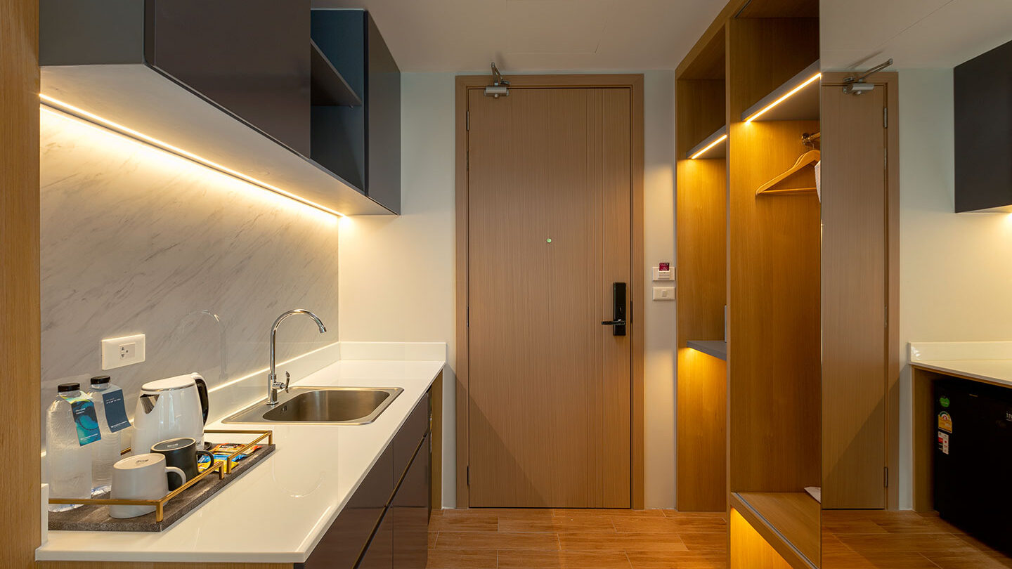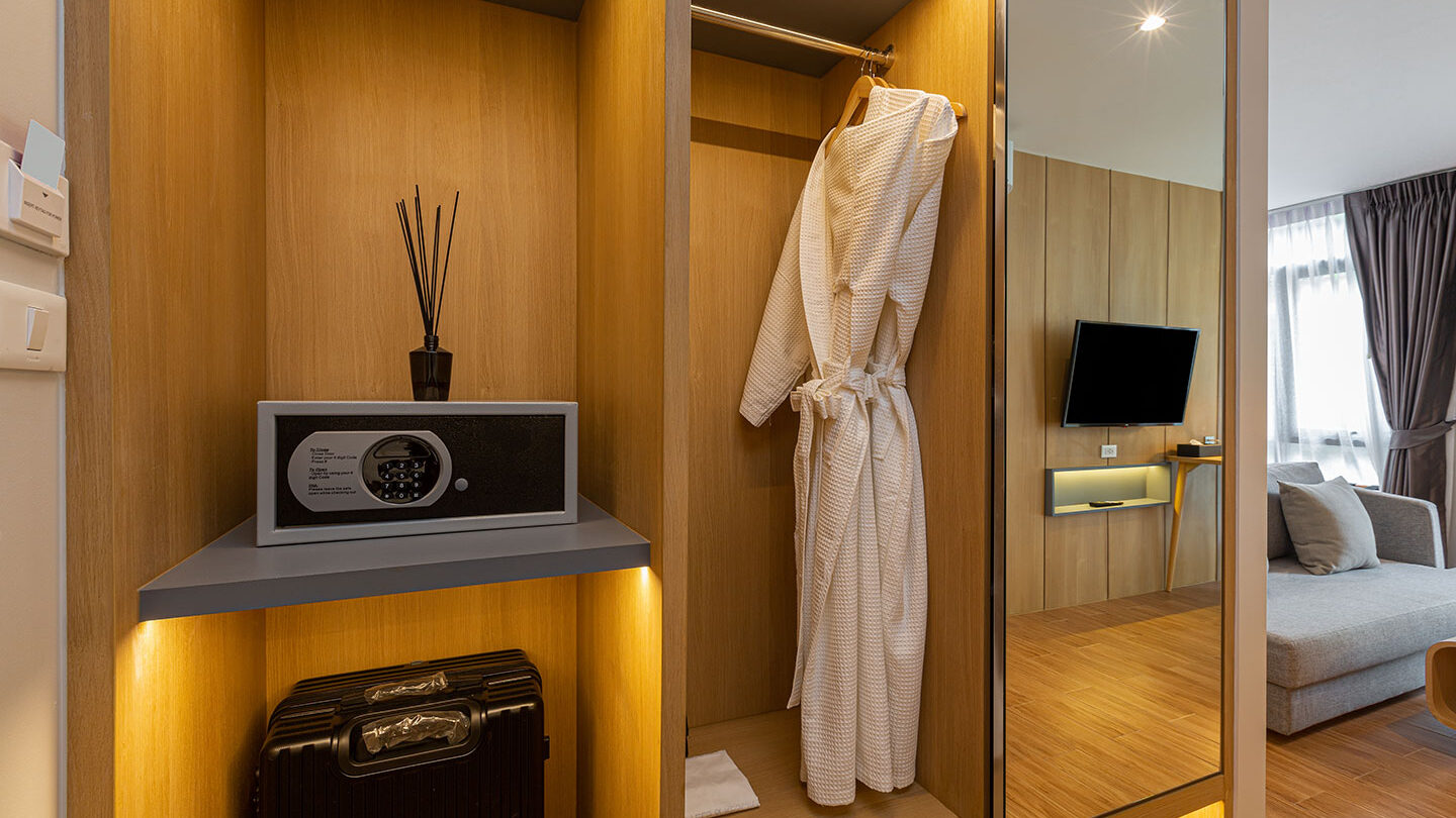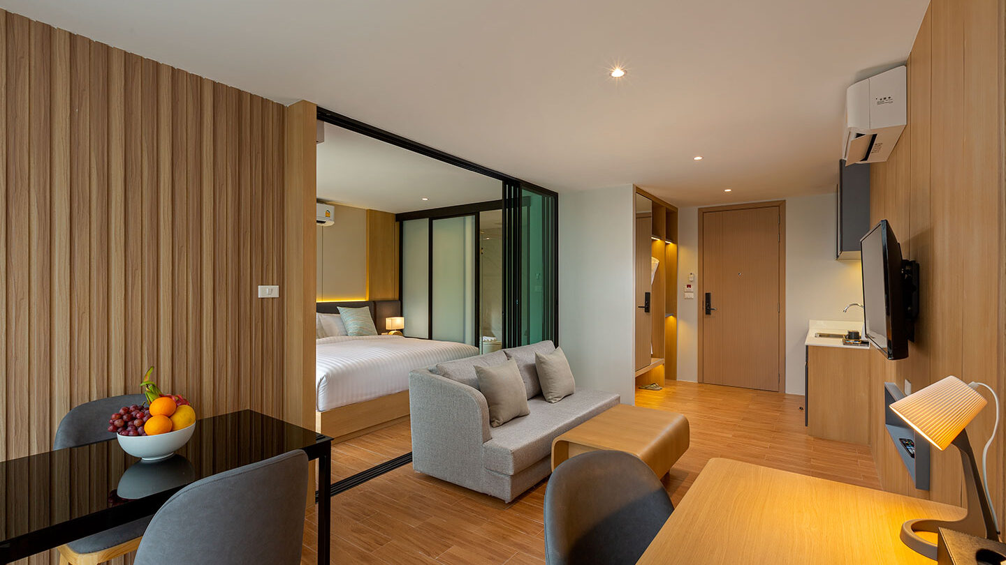 В комплектации номера Делюкс одна двуспальная или две односпальные кровати, гостиная зона с мягкой мебелью, ванная комната с тропическим душем, феном, халатами, тапочками. Среди удобств Wi-Fi, кондиционер, мини-бар, сейф, утюг и гладильная доска, зонт, телевизор, телефон, принадлежности для приготовления чая и кофе.