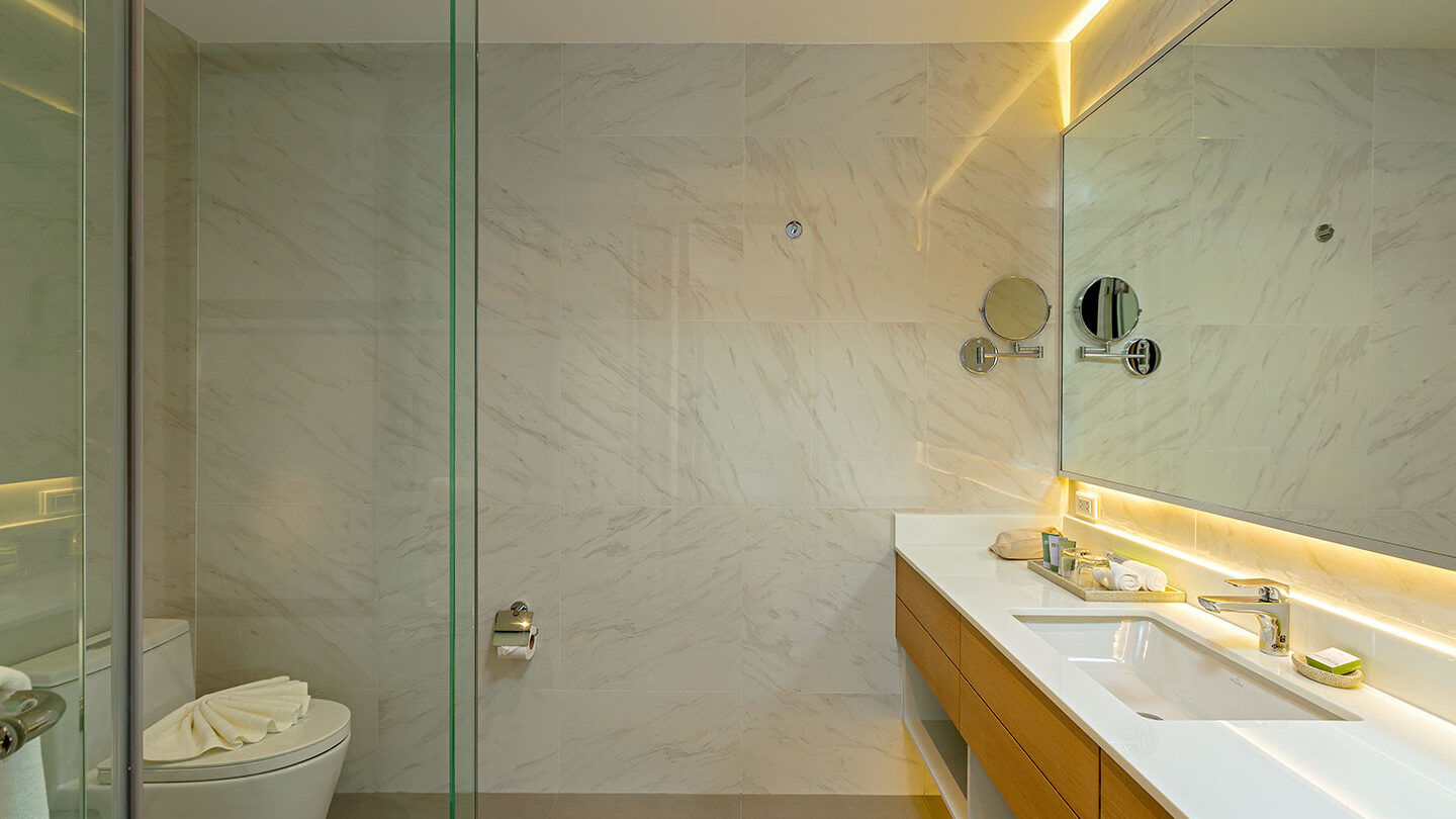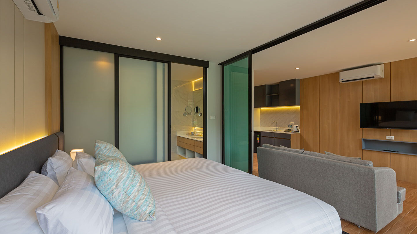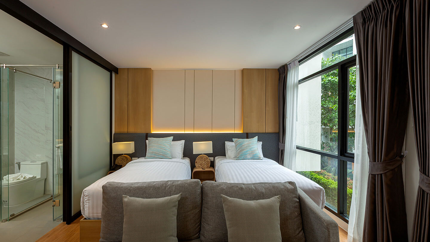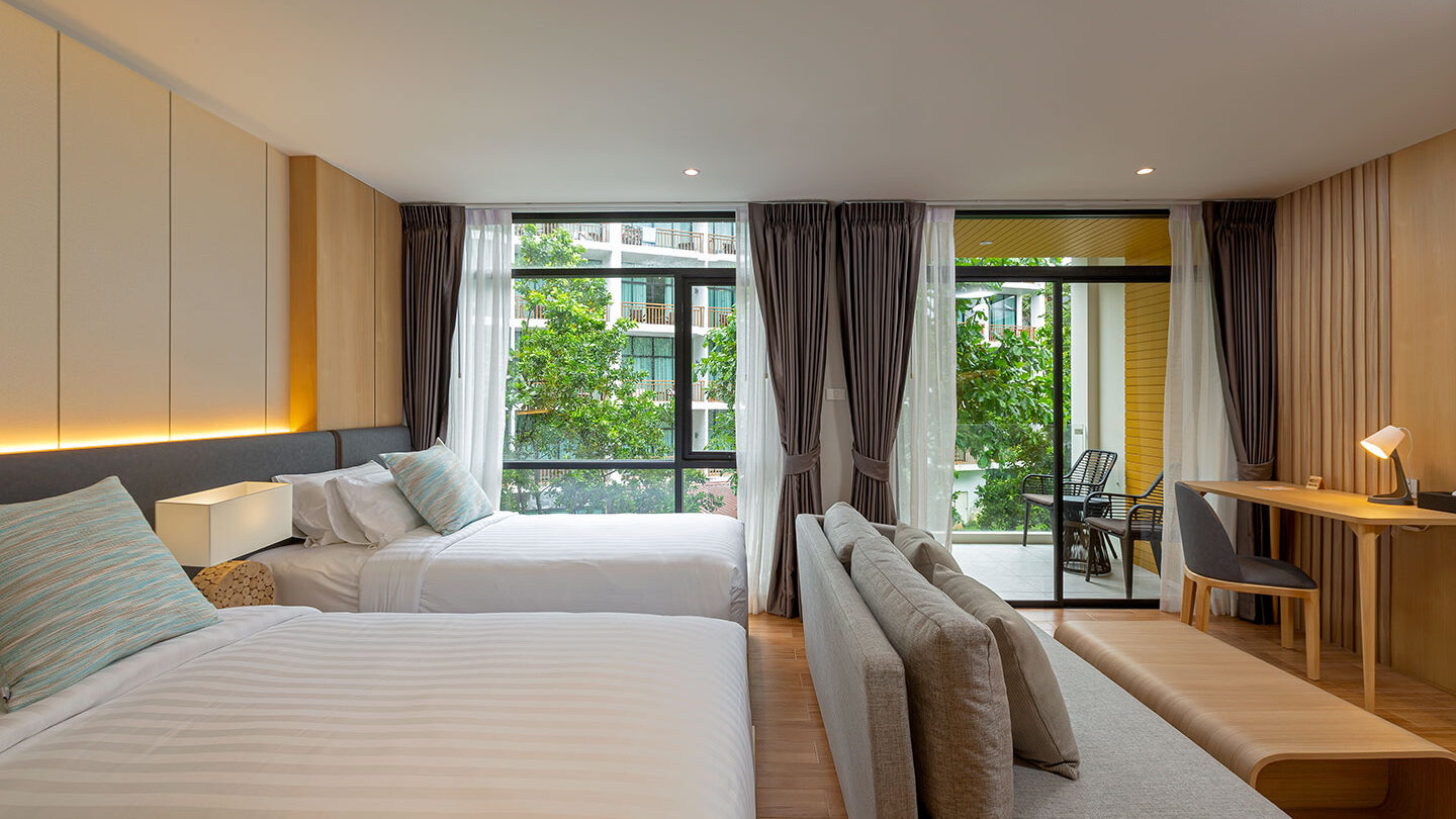 Семейный люкс состоит из двух спальных комнат, двух ванных комнат с душем, гостиной с обеденным столом, балкона. Гости располагаются на одной двуспальной кровати king-size и одной односпальной кровати. Из удобств Wi-Fi, кондиционер, телевизор, сейф, мини-бар, набор для приготовления чая/кофе, фен, тапочки, халаты, набор гостиничной косметики, утюг и гладильная доска, зонтик.